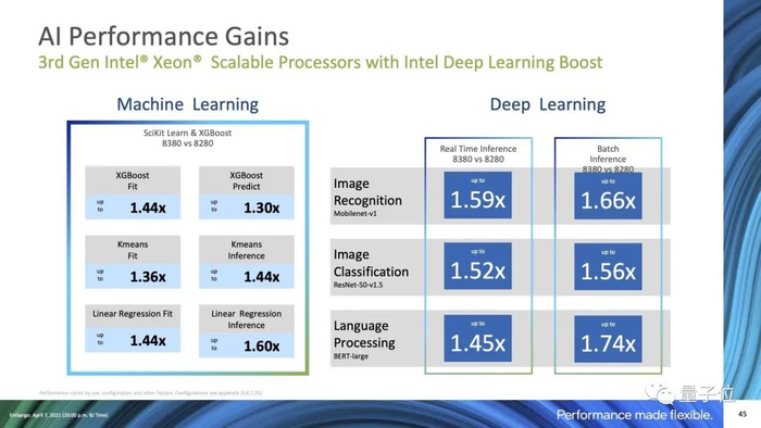 得益于AVX-512矢量指令集,以及内置的DL Boost功能,新一代至强在图像识别上的进步明显,相比上一代,MobileNet提升了66%,BERT语言处理提升了74%。