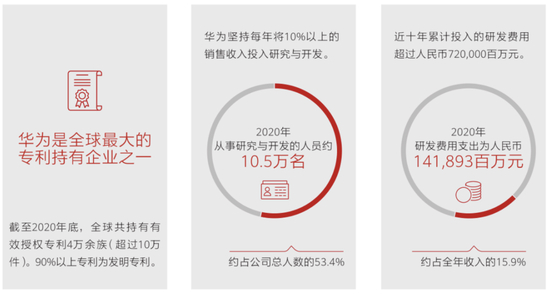 实际上,华为坚持每年将10%以上的销售收入投入研究与开发中。过去十年,公司研发费用合计超过7200亿元,高居中国企业第一。截至2020年末,华为全球研究及开发员工达到10.5万人,研发人员占总员工数的比例为53.4%。公司目前在全球拥有的有效授权专利超过10万件,其中90%以上专利为发明专利。