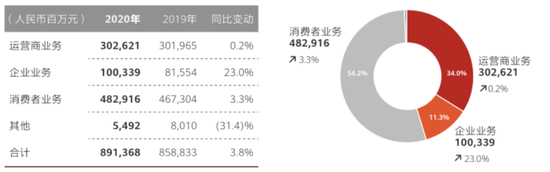 在公布业务的三大板块中,华为消费者业务收入为4829亿元,同比增长3.3%;运营商业务收入为3026亿元,同比增长0.2%;企业业务收入为1003亿元,同比增长23%。