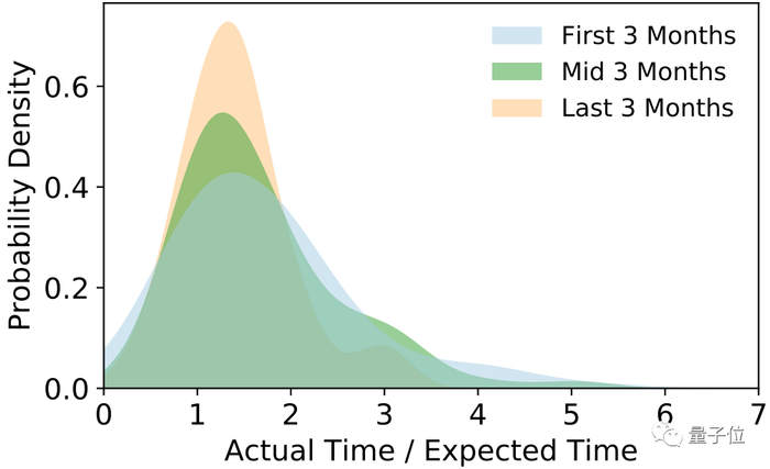 作者又统计了这9个月的最初三个月、中间三个月和最后三个月,能按时完成任务的概率。