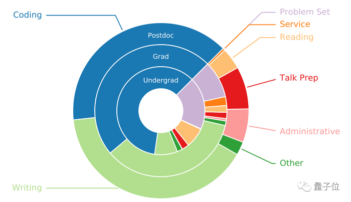 从下图中来看,本科生虽然编程量大,但码字、写论文的任务却相对最少,也比较轻松。