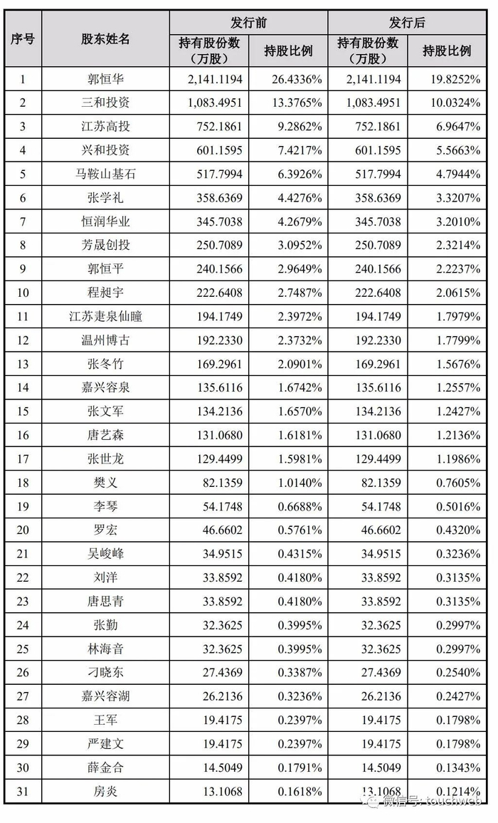 IPO后,郭恒华直接持股为19.8252%,三和投资持股为10%,江苏高投持股为6.9647%,兴和投资持股为5.5663%,马鞍山基石持股为4.7944%;张学礼持股为3.3207%,恒润华业持股为3.2010%,芳晟创投持股为2.3214%;