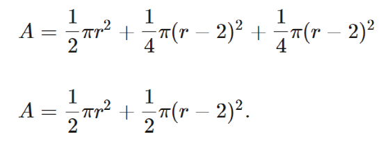 如果2 < r ≤6,总面积是一个半圆加上我们之前求出的两个四分之一圆。半圆的半径是 r,四分之一圆的半径是 r-2,因为需要两个单位的额外绳子才能到达拐角,而剩下的绳子就像是以拐角为中心的四分之一圆的半径。