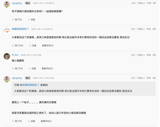 去年5月,两大选秀节目热播时,一条“蒙牛 难喝”的微博一度登上了微博热搜。一位给《青春有你》打投的粉丝称,自己搬了30箱花果轻乳到办公室,免费赠送给公司员工,后来他们都表示“不想再喝了”。不少粉丝群或社交平台上,很多粉丝也吐槽“这是把奶兑稀了所以叫轻乳”,并号召不想喝只想投票的粉丝一起捐掉做慈善。