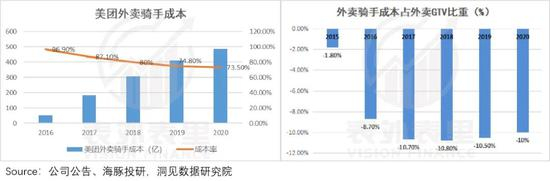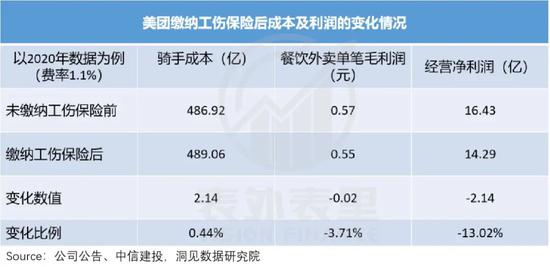 ·2020年骑手成本为486.92亿,缴纳工伤保险后,成本上升486.92 x40%x1.1%≈2.14亿,上升比例为0.44%。