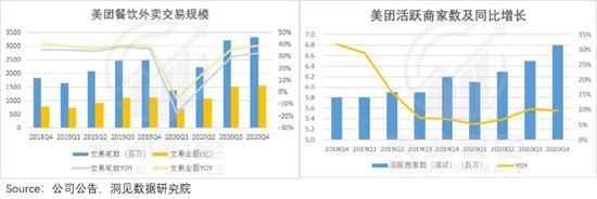 根据财报数据,美团2020Q4餐饮外卖笔数超过33亿笔,交易金额超过1562亿;活跃商家数已达到680万,并且过去4个季度内不断增长。