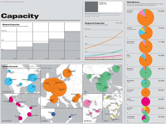 “一张图”指的是TeleGeography 的“2021全球互联网地图”,这几乎是世界上唯一能展现出全球网络如何连接的可视化地图,一直以来也是专业领域人士评估重大海外部署决策时的情报来源!