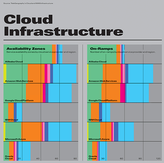 1) 领先地位较大的有四大提供商。云可用区总数:AWS > Google Cloud > MS Azure > 阿里云。云接口总数与可用区总数排名大致相同。