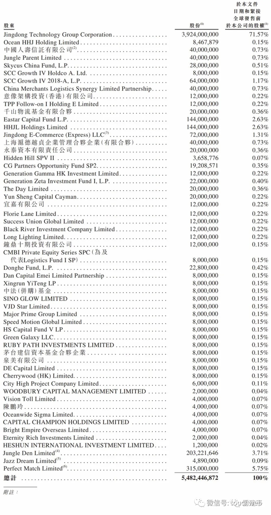 IPO后,京东集团持股为64.42%,依然为大股东,中国人寿信托有限公司持股0.66%,Jungle Parent Limited持股为0.66%;