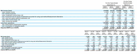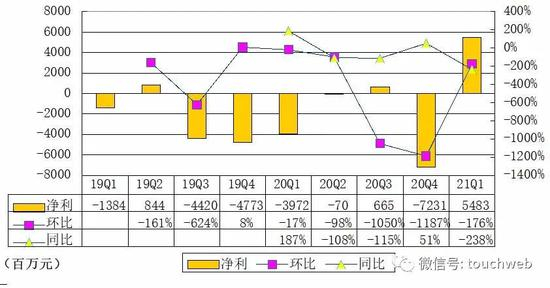 滴滴2018年、2019年、2020年净亏损分别为149.79亿元、97.33亿元、106.08亿元(约16.19亿美元);滴滴2021年第一季度利润为54.83亿元(约8.37亿美元),上年同期的净亏为39.72亿元。
