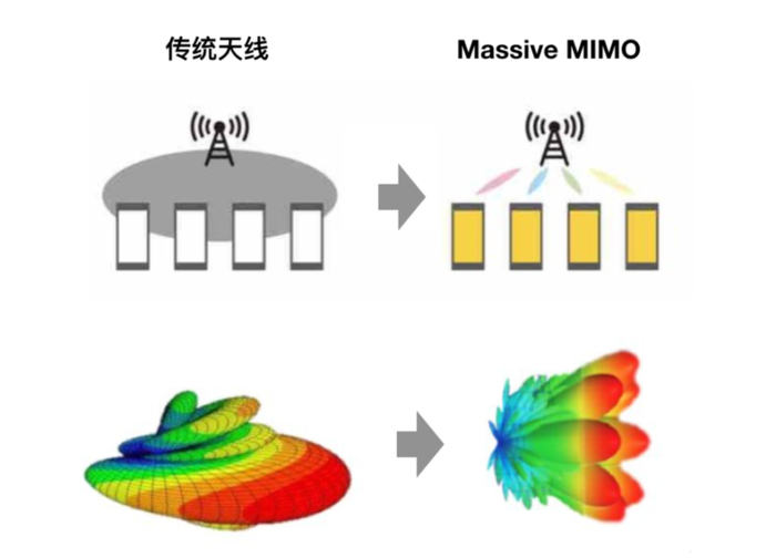 Massive MIMO,指通过在基站侧集成大量的天线单元和更多的射频通道,来实现三维精准波束赋形和多流多用户复用,从而提升覆盖和容量,以及减少干扰。
