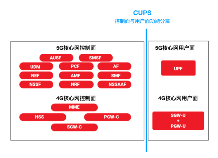 CUPS(Control and User Plane Split),控制面和用户面功能分离,指将负责连接管理、QoS策略、用户鉴权等功能的控制面功能与负责数据流量转发的用户面功能分离,以简化和统一整个网络架构,使核心网更加灵活、高效。在CUPS架构下,随着数量流量增加,用户面功能可在不影响控制面的前提下独立扩展,同时也便于控制面集中管理。