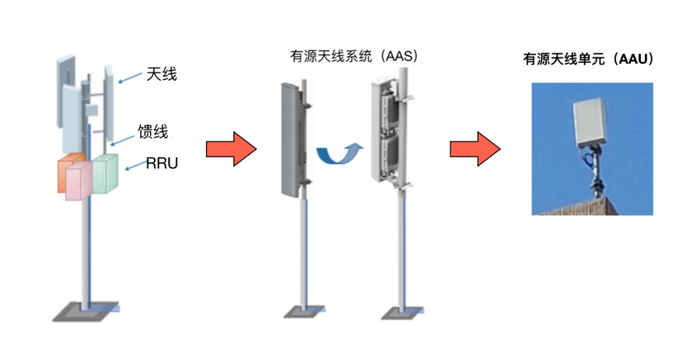 过去,RRU和天线分离,两者之间通过射频馈线连接。AAS将射频收发单元与天线阵列集于一体后,可支持Massive MIMO技术,可减少射频馈线损耗,可提升网络覆盖范围和容量,减少天面占用空间和维护工作量。