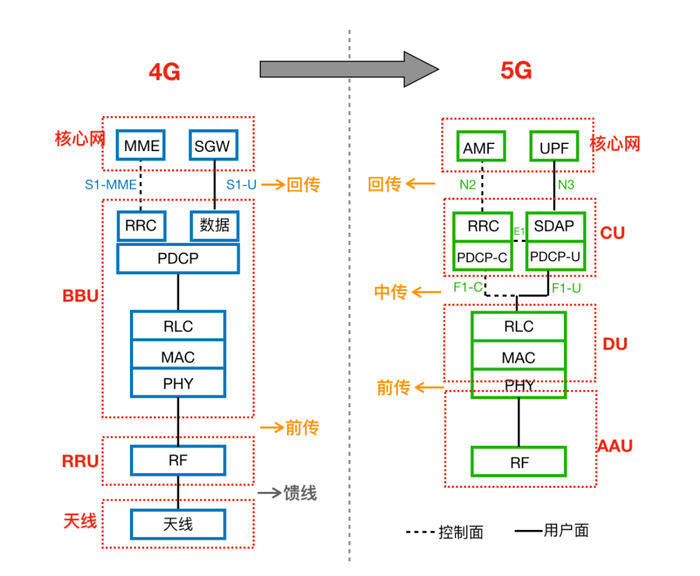 Midhaul,中传,指CU与DU之间的传输网络。