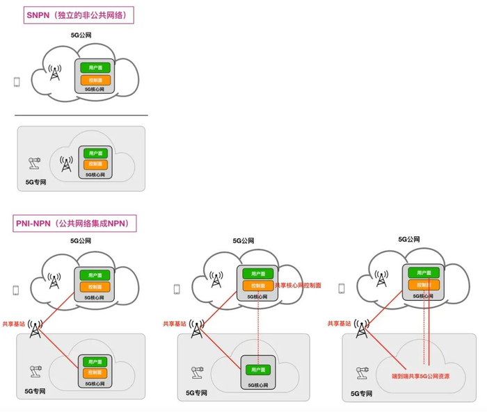 Private 5G,5G专网,指采用3GPP 5G标准构建的企业或行业无线专网。3GPP标准定义了两种5G专网部署模式:SNPN(独立的非公共网络)和PNI-NPN(公共网络集成NPN)。PNI-NPN,就是我们常说的“公网专用”,指企业可通过与运营商5G公网共享RAN,或者共享RAN和核心网控制面,或者端到端共享5G公网(端到端网络切片)的方式来部署5G专网;SNPN,就是我们常说的“独立部署模式”,指企业独立部署从基站到核心网到云平台的整个5G网络,可以与运营商的5G公网隔离。