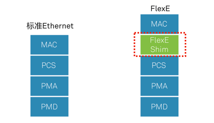 FlexE(Flexible Ethernet),灵活以太网,由光互连论坛(OIF)于2016定义的一种标准,其在标准以太网基础上引入了FlexE Shim层,实现了MAC与PHY层解耦,从而可实现灵活的速率适配,可通过多个物理链路捆绑扩展网络容量,满足5G所需的大带宽需求,也可通过Shim层的时隙配置支持多项业务,实现多业务之间的物理隔离。对于端到端5G网络切片,FlexE 是一项关键技术,可在共享网络基础设施的基础上实现网络硬切片,实现业务隔离。