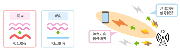 Beamforming,波束赋形。无线电波就像波浪一样,相互碰撞(干扰)时会变强或变弱,这取决于它们之间如何碰撞。波束赋形正是利用了这一特点,通过多个天线单元发射相同的信号,并通过调整各个天线单元的相位和幅度,使得无线电波在特定的方向被增强,在其他方向相互抵消而减弱,让无线信号传播像波束一样更集中,从而可提升覆盖范围和减少干扰。
