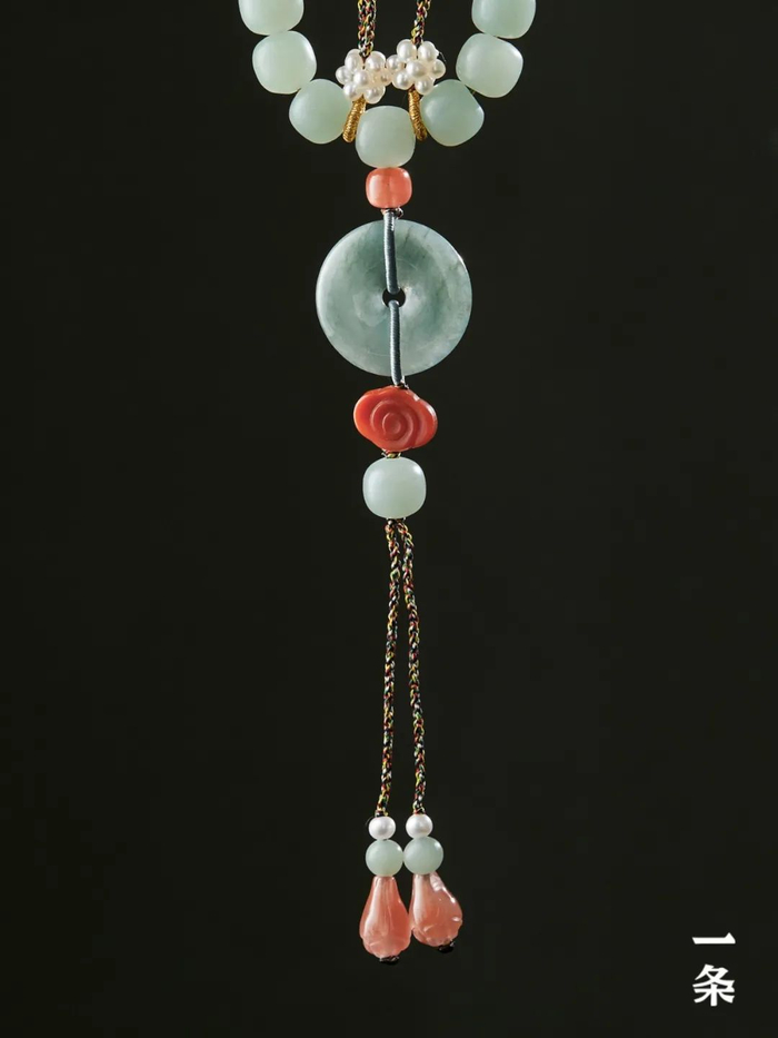 三通下方搭配天然翡翠平安扣,细腻通透,再下为南红祥云珠,弟子珠部分用珍珠、和田玉、南红玉兰花搭配,古朴雅致。