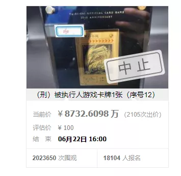 然而,近段时间,阿里司法拍卖上架的一张卡牌却打破了这些规律,吸引了不少普通人的眼球。昨日下午,在超过200万人的围观下,这张备受动漫游戏圈关注的“20周年纪念版青眼白龙”金卡在阿里司法拍卖平台上正式开拍。短短30分钟内,这张卡牌价格从80元一路飙升至8700万元,超过千人参与竞拍,竞买记录达2105条。