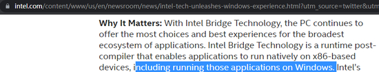 值得注意的是,这里的限制条件只有 x86,并不仅限于 Windows。事实上,英特尔的原话是“可以在 x86 设备上运行,包括 Windows”。