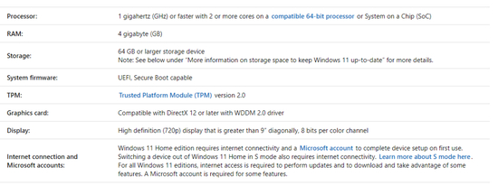 2)最低配置:64位 SoC、4GB RAM、64GB 存储空间、显卡支持 DX12、支持UEFI Secure Boot、TPMv2.0 芯片