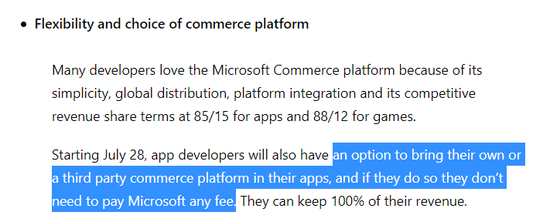 此外,微软明确表示:从7月28日开始,上架应用开发者可以使用它们自己的,或者第三方应用内支付方式(Commerce Platform),保留100%的收入。微软不会对这些应用的收入进行抽成。除了游戏,仍会有强制的12%抽成。