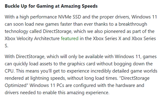 3)游戏性能重大提升:游戏开发者将可以使用一个 DirectStorage API,让系统直接快速加载游戏素材到图形处理单元,减少对 CPU 负载的压力。此 API 仅支持 Windows 11,需要特定的 PC 硬件(高性能 NVMe 固态硬盘)和对应的驱动才可以支持。