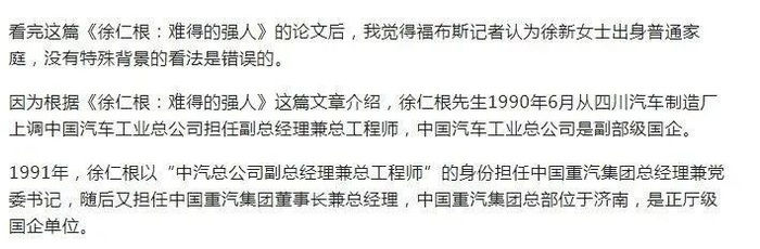 徐新曾在采访中透露过自己的父亲是四川汽车制造厂的厂长,于是就有人从《经营者》杂志里一篇名为《徐仁根:难得的强人》的文章里顺藤摸瓜。