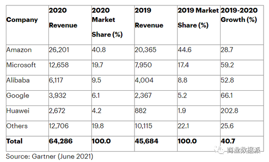 根据Gartner数据显示,2020年全球基础设施即服务(IaaS)市场规模增长40.7%,达到643亿美元,高于2019年的457亿美元。2020年,亚马逊保持IaaS 市场第一,其次是微软、阿里巴巴、谷歌和华为。