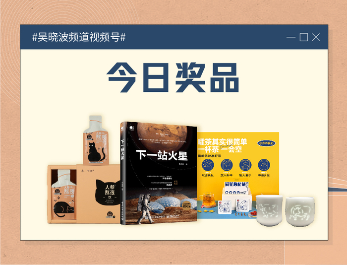 今日吴晓波奖学金:本场直播,我们会发起5轮抽奖,每轮抽1-10人送奖品一份。奖池里的奖品包括:价值99元的玉柏玲珑杯、价值39.9元的九信匠造菊花枸杞茶、价值99元的一気棒熬夜饮以及直播间同款《下一站火星》,感兴趣的朋友们千万不要错过哦~
