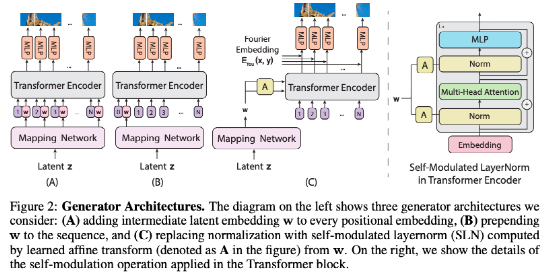 在介绍实验模型之前,作者先讨论两个可信的基线模型,如Fig. 2 (A)和2 (B)所示。这两个模型交换ViT的输入和输出,从嵌入物中生成像素,特别是从潜伏向量 w,即w=MLP(z)(Fig. 2中称为映射网络),由MLP从高斯噪声向量z中导出。