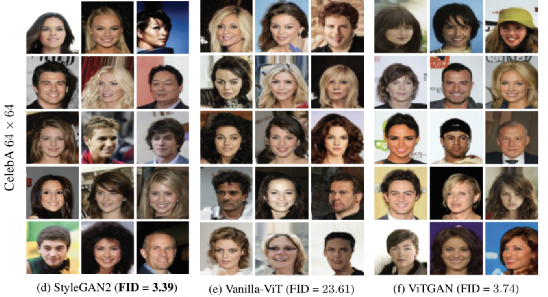 3. ViTGAN模型展示了在标准图像生成基准(包括CIFAR、CelebA和LSUN bedroom数据集)中,这种Transformer与最先进的卷积架构具有可比性的方法。