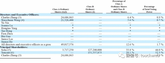 搜狐持股为33.8%,有44%的投票权;腾讯持股39.1%,有52.3%的投票权。