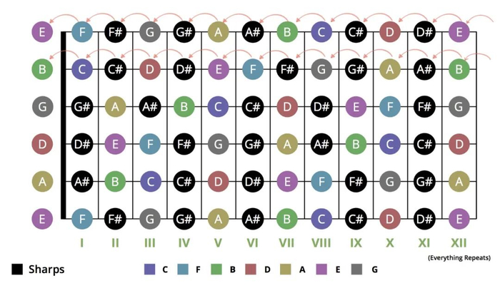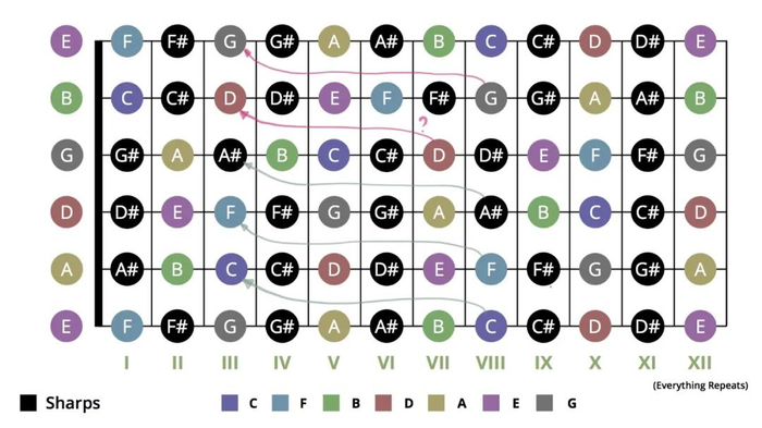 在文章中,他利用在计算机领域的知识发现在吉他最常用的调音方式中存在着重大的bug:他发现吉他的每根弦与上一根都是差了5个半音阶,但从第五弦就不是这样了。