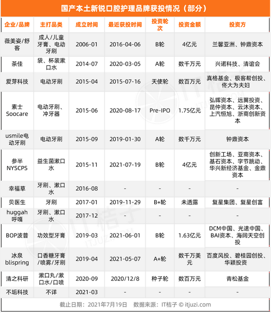 事实上,IT 桔子梳理发现,除参半外,目前已有 BOP 波普、清之科研、茶佳、usmile、贝医生、幸福草 、素士 、不垢科技等新锐口腔护理品牌涌现,并获得资本青睐。除了专业的风险投资机构,连百度风投、字节跳动都参与进来了。