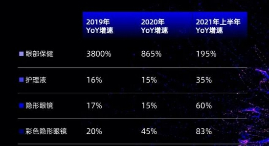 阿里健康旗下天猫医药健康平台发布的《天猫隐形眼镜行业人群洞察白皮书》(下简称“白皮书”)中提到,彩片占据隐形眼镜市场近六成,品牌竞争也最激烈,以同比19%的增速保持增长。2021年上半年YoY增速达到83%,而在2019年,这一数字仅为20%。