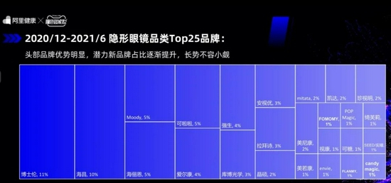 同时,根据天猫2021年上半年隐形眼镜行业的数据,Top25的品牌中,包括博士伦、海昌、海俪恩、爱尔康等老牌品牌,moody等新品牌,排名前5的品牌市场格局集中度不到37%,前十的集中度不到48%。市场极度分散,且市场占有率变化较大。