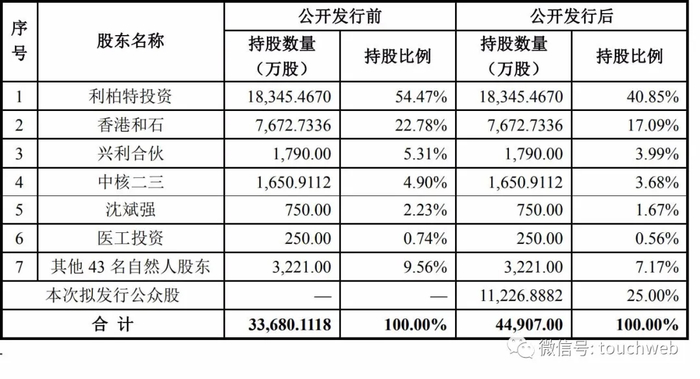 IPO后,利柏特投资持股为40.85%,香港和石持股为17.09%,兴利合伙持股为3.99%,中核二三持股为3.68%,沈斌强持股为1.67%。
