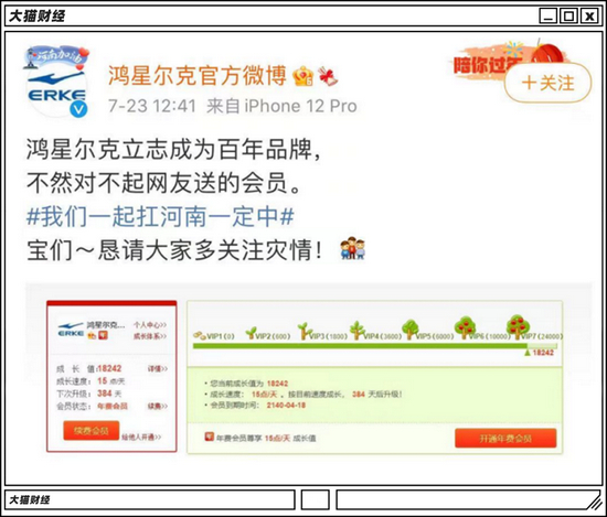 先有网友发现,鸿星尔克的官方微博账号居然不是会员,立马安排,掏钱充了整整119年的会员。