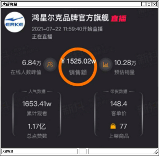 没多久,鸿星尔克直播的销售额已经突破了1亿元。