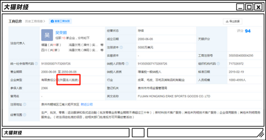 天眼查显示,鸿星尔克的企业类型是“有限责任公司(外国法人独资)”,由冠基投资有限公司(英属维尔京群岛)全资控股。