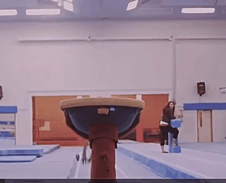 翻上跳板时的动作非常笔直,跳上跳马后她将身体弯曲成一个长枪状,保持屈腿姿势在空中完成了两次后空翻。