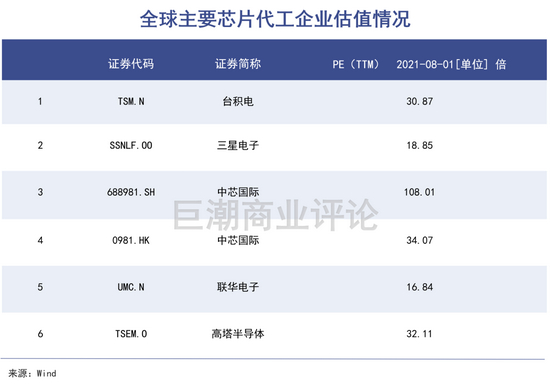和“友商”对比来看,台积电、三星、联华电子只有二、三十倍左右的市盈率,中芯国际高达上百倍。制程工艺在国际上尚未达到顶尖水平,却收获了超越国际顶尖公司的估值水平。