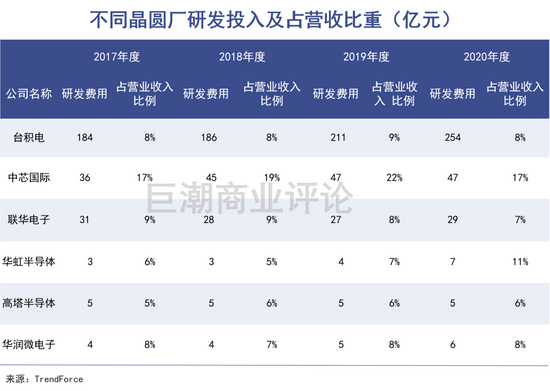 技术研发投入上,中芯国际研发资金占营收比重其实并不低,近4年维持在20%上下,台积电为8%左右。但研发投入规模方面,相去甚远,比如2020年台积电研发费用用254亿元,中芯国际为47亿元,台积电是中芯国际的5.4倍。