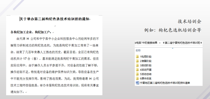 甚至这些还不够,杜忠还联合当地科技局开展枸杞色选技术培训会,积极将色选工艺和技术传播出去。在行业人眼中,他们已经不是卖产品的,而是帮自己解决问题的专家。