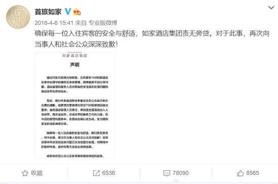 在社会舆论一面倒的情况下,如家酒店集团发布了第三篇声明,“确保每一位入住宾客的安全与舒适,如家酒店集团责无旁贷。对于此事,再次向当事人和社会公众深深致歉!”这也是在事件发生多时后,如家酒店集团首次正式公开道歉。