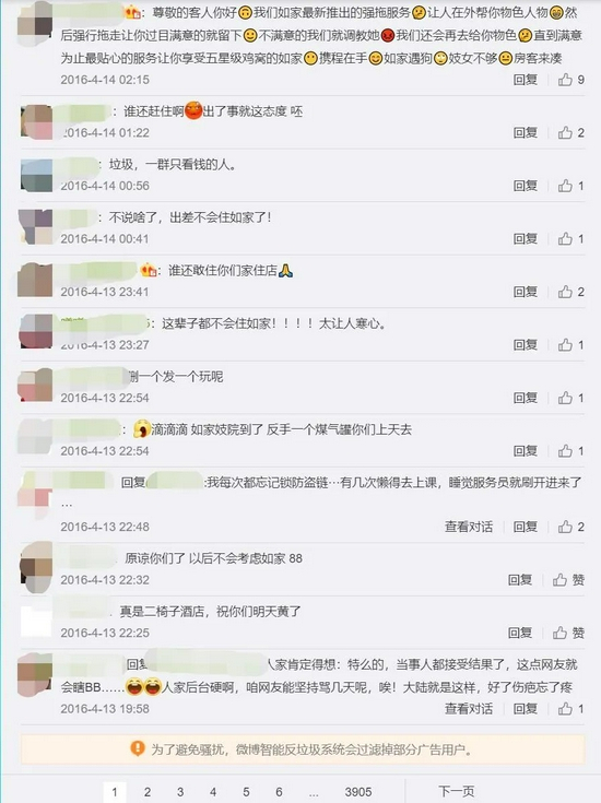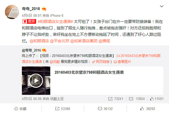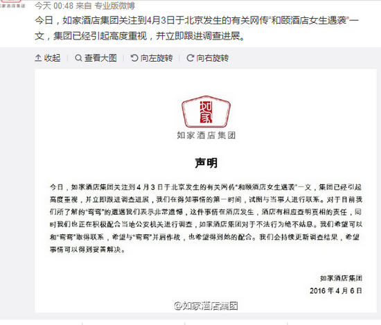 在事发后近24小时候的次日凌晨,可能是迫于舆论压力,和颐酒店所在的如家酒店集团才在其官方微博上发表对此事的声明(目前已删除),“如家酒店集团关注到4月3日于北京发生的有关网传“和颐酒店女生遇袭”一文,集团已经引起高度重视,并立即跟进调查进展。”