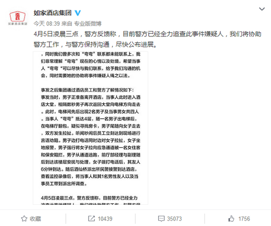 随后,如家酒店集团在上午8点再次发表声明(目前已删除)称,“4月5日凌晨三点,警方反馈称,目前警方已经全力追查此事件嫌疑人,我们将协助警方工作,与警方保持沟通,尽快公布进展。”
