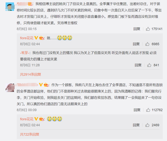 此外,不少网友也对于花花的遭遇感同身受。有网友称,“对于装修时间比较长的全季酒店,遇到好几次门不好关紧的房间,印象中有一次白天入住后呆了一下午,出门时才发现门没关上,仔细听才发现未关闭提示音量很小,感觉是门板下坠而酒店没有及时维修。”