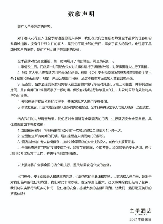 再看全季酒店的回应,8月5日晚间当事人发表视频,8月6日全季酒店发布致歉声明,表示第一时间展开了内部调查,并结合内部调查结果,将对全国所有全季酒店的门店,进行酒店安全全面自查,具体整改措施包括:加强夜间安保,将现有的夜间2小时一次楼层巡检全部变为1小时一次;全面检查所有房间的门锁,增加提醒客人锁闭房门的标识。